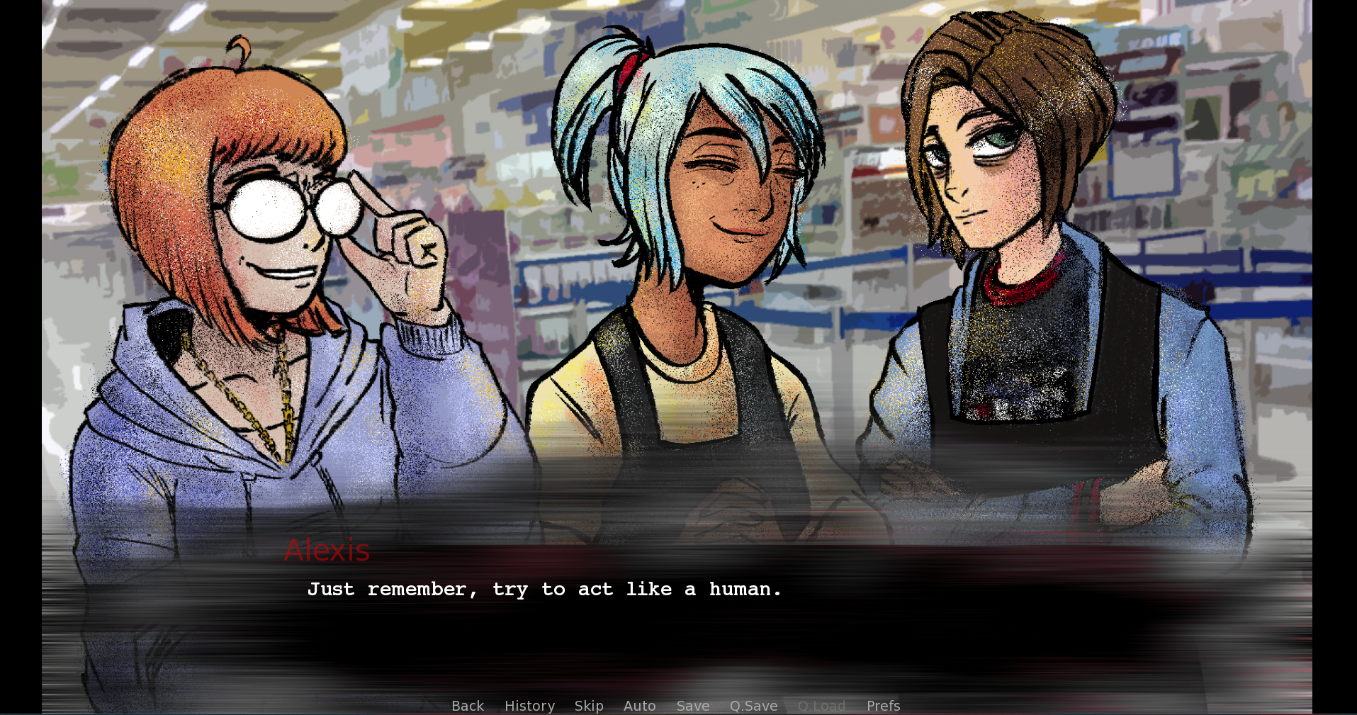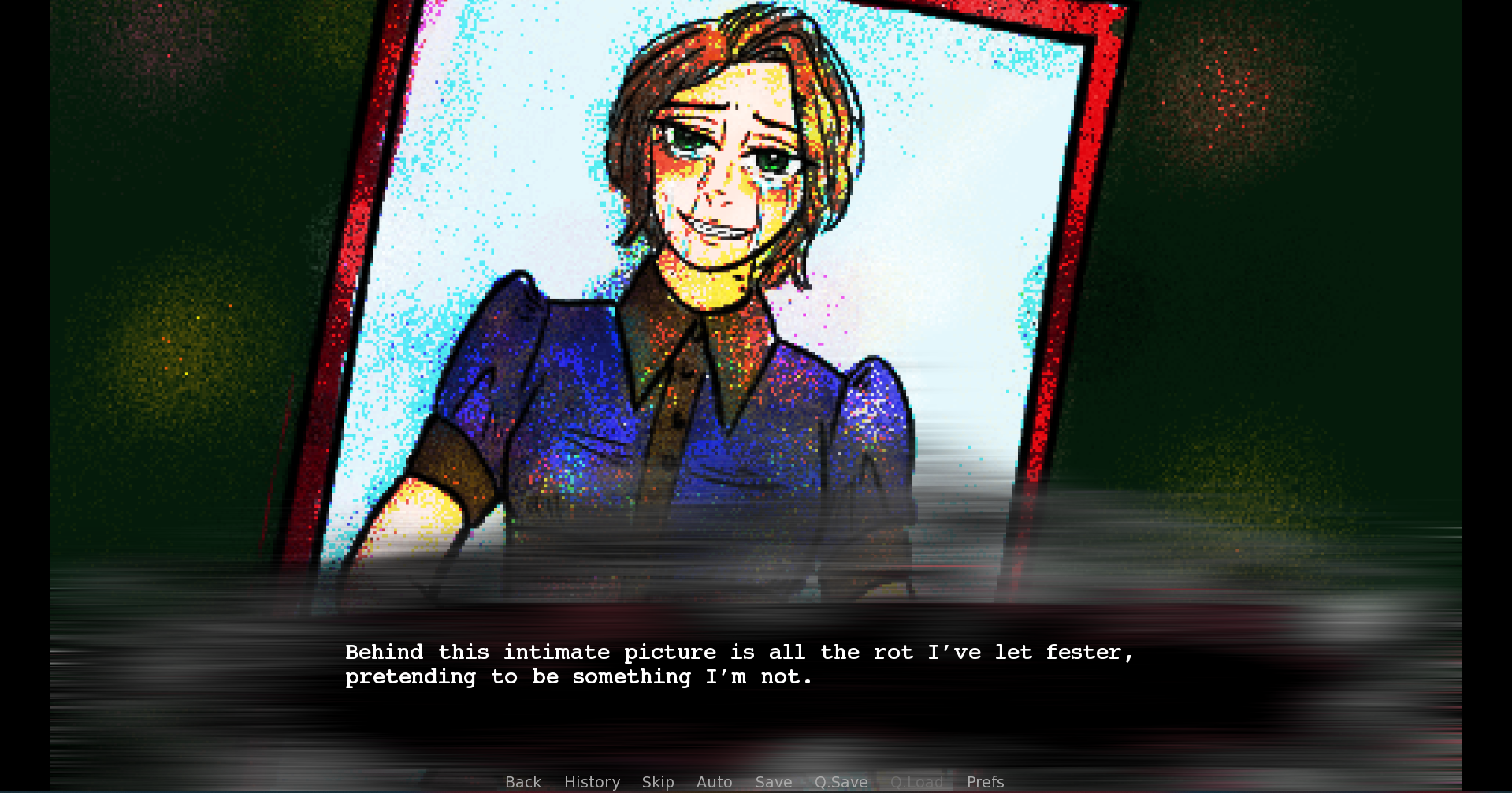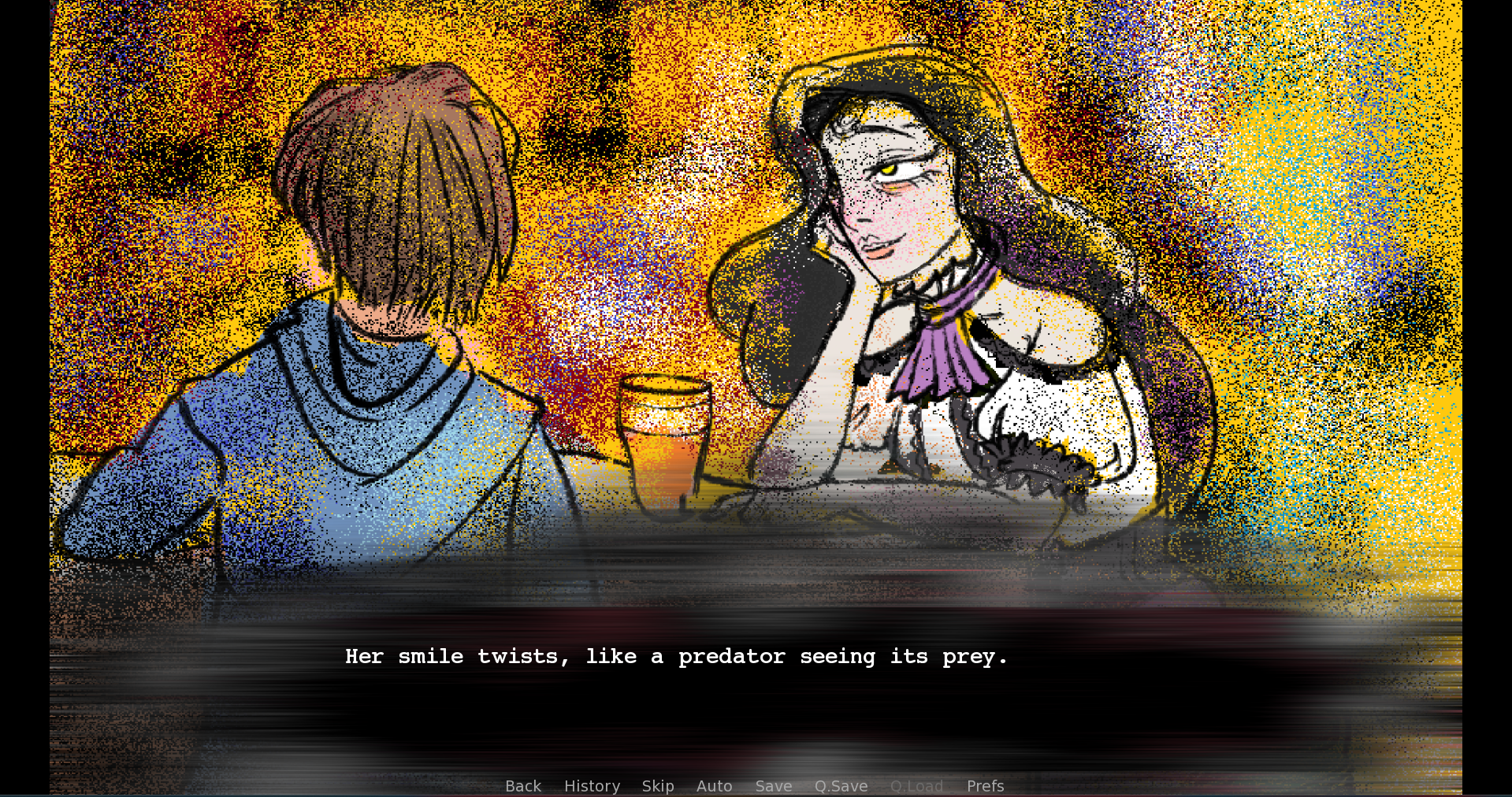 The game has great artwork. The characters have super dynamic poses, with cool clothes, excellent face emotions. Manager’s customer service fake smile vs real death glare was cute. Many amazing CGs and distortions and glitch special effects emphasized MC’s tumult. There's great body horror in the brutal vampire changes. The unique art style noise felt like Monet impressionist paintings made computery. The noise reminds me of gaussian splatting photogrammetry.